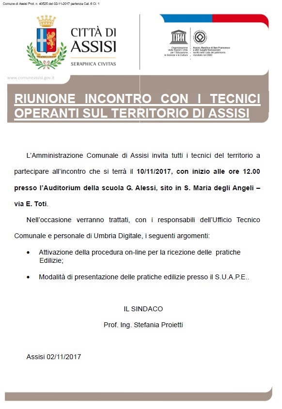 Si informa che lAmministrazione Comunale di Assisi ha organizzato un incontro con i tecnici operanti nel territorio comunale in data 10/11/2017, alle ore 12, presso lAuditorium della scuola G. Alessi, sito in S. Maria degli Angeli, come da avviso allegato.