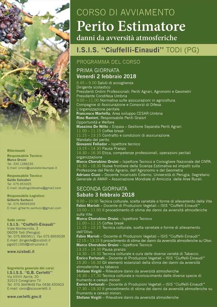 Il 2/3 febbraio 2018, presso l´I.S.I.S. "Ciuffelli-Einaudi" di Todi (PG), si svolgerà il corso di avviamento "Perito estimatore danni da avversità atmosferiche". Il corso avrà la durata di 16 ore.