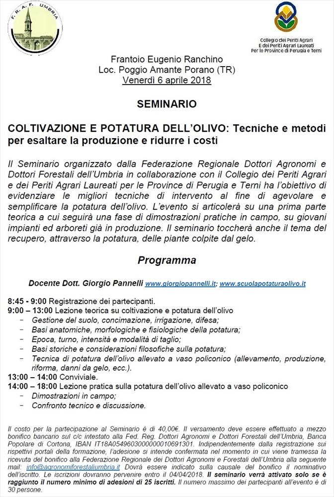 Il 6 aprile 2018, presso il Frantoio Ranchino a Porano (TR), si svolgerà il seminario "Coltivazione e potatura dell´olivo" organizzato dalla Federazione Regionale Dottori Agronomi e Dottori Forestali dell’Umbria, in collaborazione con il Collegio dei Periti Agrari e dei Periti Agrari Laureati per le Province di Perugia e Terni.