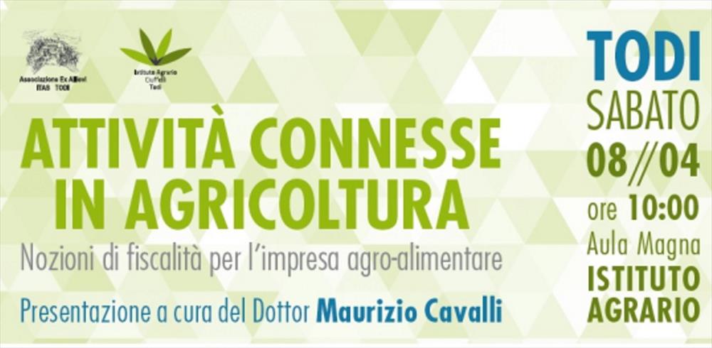 Sabato 8 aprile 2017, alle ore 10, nell´Aula Magna dell´Istituto Agrario di Todi, verrā presentata la pubblicazione "Attivitā connesse all´agricoltura" del dottor Maurizio Cavalli, una guida tecnica che verrā presentata e messa a disposizione gratuitamente degli studenti diplomandi e degli imprenditori agricoli.