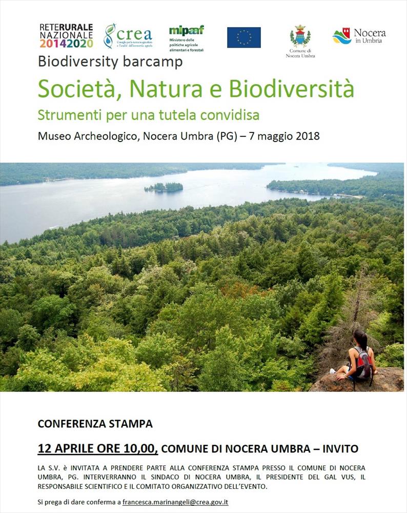 Il Comitato Scientifico ed organizzativo del Biodiversity Barcamp “Società, natura e biodiversità: strumenti per una tutela condivisa” , che si terrà a Nocera Umbra (Pg), il 7 maggio 2018, invita a partecipare alla conferenza stampa di presentazione dell´evento che si svolgerà presso il Comune di Nocera Umbra il 12 aprile 2018 alle ore 10.