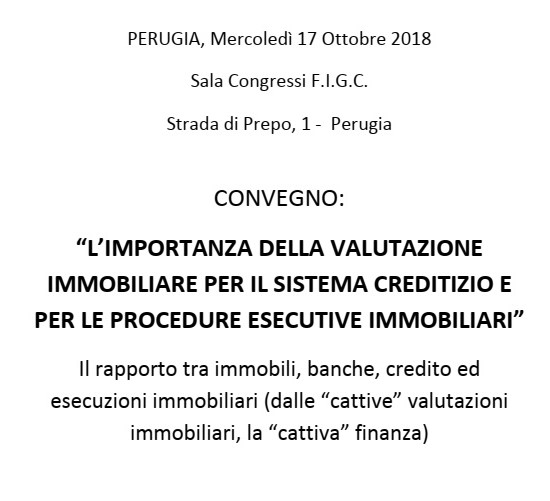 Il 17 ottobre 2018, presso la Sala Congressi F.I.G.C di Perugia, si terrà il convegno "LŽimportanza della valutazione immobiliare per il sistema creditizio e per le procedure esecutive immobiliari" come da programma allegato.
