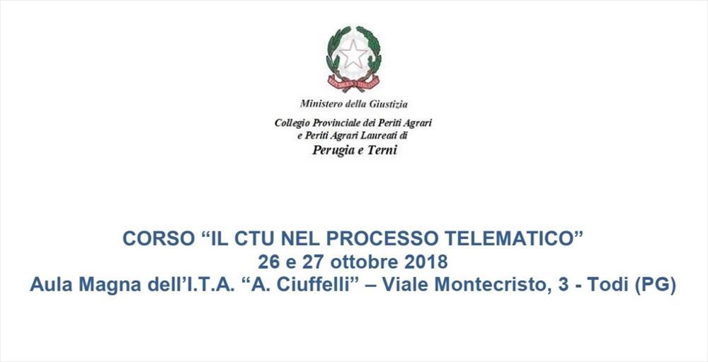Il Collegio ha organizzato il corso “Il CTU nel processo telematico” che si terrà nei giorni 26/27 ottobre 2018, presso l’aula Magna dell’Istituto Agrario “A. Ciuffelli” di Todi.