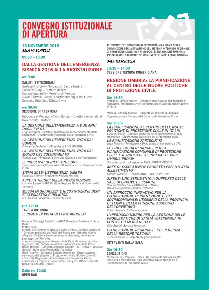 La manifestazione avrà inizio Venerdì 16 novembre con il Convegno istituzionale di apertura “Dalla gestione dell’emergenza sismica 2016 alla ricostruzione” che proseguirà, nel pomeriggio, con la sessione tecnica di approfondimento “Regione Umbria: la pianificazione come elemento chiave nelle nuove politiche di Protezione Civile”.