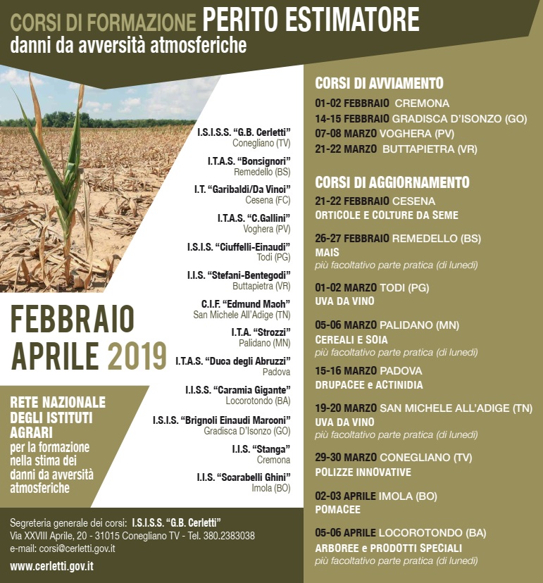 Si pubblicano i depliant dei corsi in oggetto organizzati dall’Istituto Statale di Istruzione Secondaria Superiore “G.B. Cerletti” di Conegliano Veneto (TV), in collaborazione con la rete degli Istituti Tecnici Agrari.