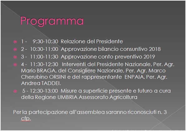 E’ convocata l’Assemblea ordinaria degli iscritti per l’approvazione dei conti che si terrà in seconda convocazione il giorno Sabato 30 marzo 2019 alle ore 09,30, presso la Sala Padiglione 8 di UmbriaFiere Spa – Piazza Moncada – Bastia Umbra (PG).