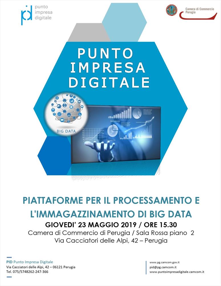 La Camera di Commercio di Perugia organizza l’evento formativo gratuito del PID, Punto Impresa Digitale Perugia, che si terrà Giovedì 23 Maggio alle ore 15.30 presso la Sala Rossa della CCIAA ed avrà ad oggetto le "Piattaforme per il processamento e l’ immagazzinamento di Big Data".