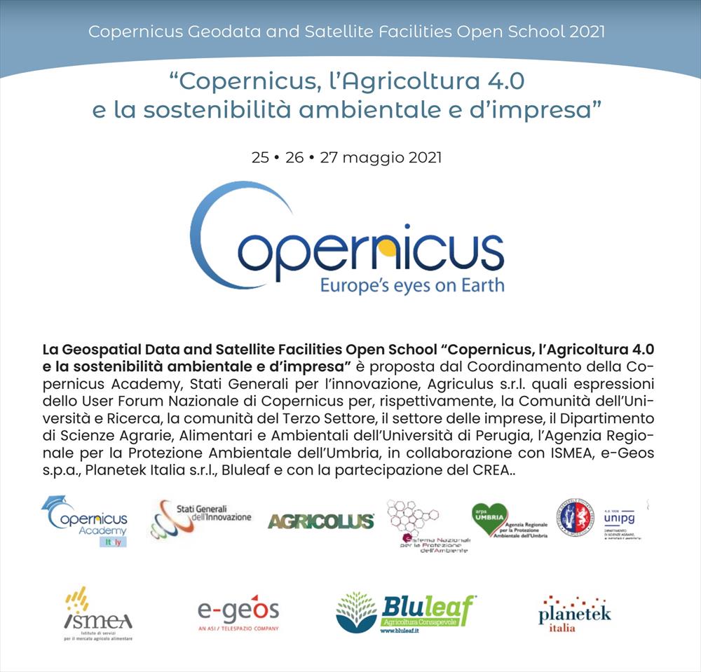 Home / News / SAVE THE DATE - 25, 26, 27 maggio 2021 - Copernicus Geodata and Satellite Facilities Open School 2021 “Copernicus, l’Agricoltura 4.0 e la sostenibilità ambientale e d’impresa”