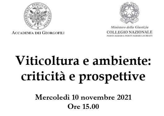 Si informa che Mercoledì 10 novembre 2021, alle ore 15:00, si terrà il convegno “Viticoltura e ambiente: criticità e prospettive” organizzato dall’Accademia dei Georgofili ed il Collegio Nazionale dei Periti Agrari e P.A.L.