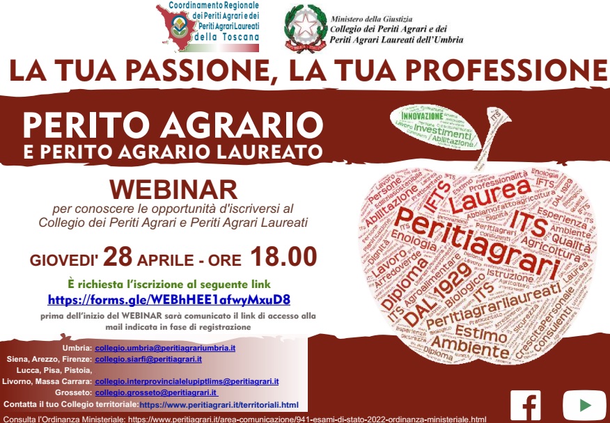 28/04/2022 ORE 18 - WEBINAR RIVOLTO AI CANDIDATI ALL´ESAME DI STATO per conoscere le opportunità d´iscriversi al Collegio dei Periti Agrari e Periti Agrari Laureati