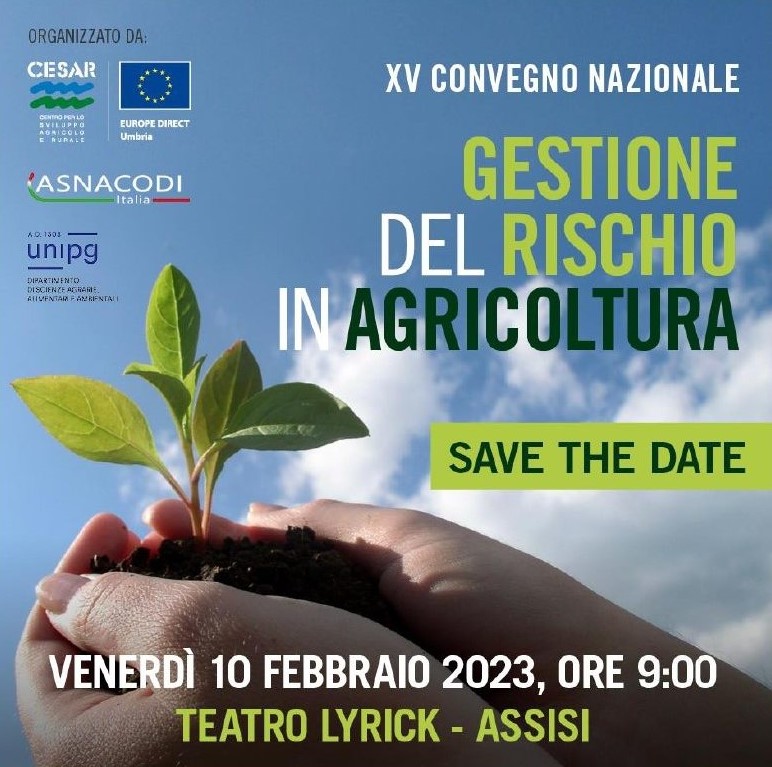 Venerdì 10 febbraio 2023 presso il Teatro Lyrick di Assisi si terrà la XV edizione del Convegno Nazionale sulla gestione del rischio in agricoltura organizzato da CESAR, Asnacodi Italia, DSA3-UNIPG con il supporto di ISMEA e ANIA.