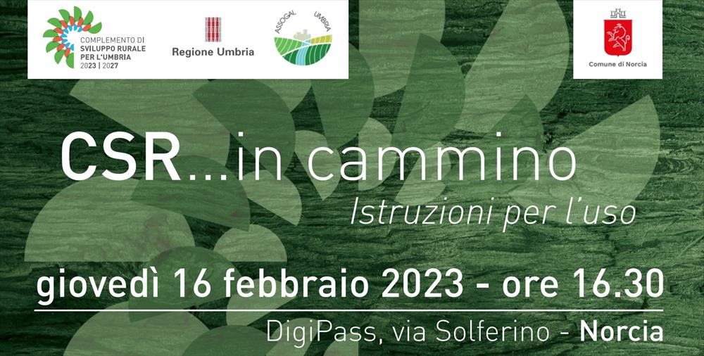 La Regione Umbria - Autorità di Gestione del PSR e AssoGAL Umbria presentano un ciclo di incontri dal titolo "CSR...in cammino - Istruzioni per l´uso". Il format, omogeneo e itinerante, farà tappa a Norcia giovedì 16 febbraio 2023 alle ore 16.30 per raccontare le opportunità del nuovo documento di programmazione dello sviluppo rurale: il Complemento di Sviluppo Rurale per l´Umbria 2023/2027 (CSR).