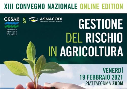 Venerdì 19 febbraio 2021 si terrà in modalità on line l´evento XIII Convegno Nazionale Gestione del Rischio in Agricoltura organizzato da CESAR e ASNA...