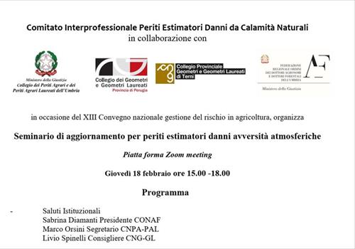 Si comunica che Giovedì 18 febbraio 2021, alle ore 15, si svolgerà il Seminario di aggiornamento per periti estimatori danni da avversità atmosferiche...
