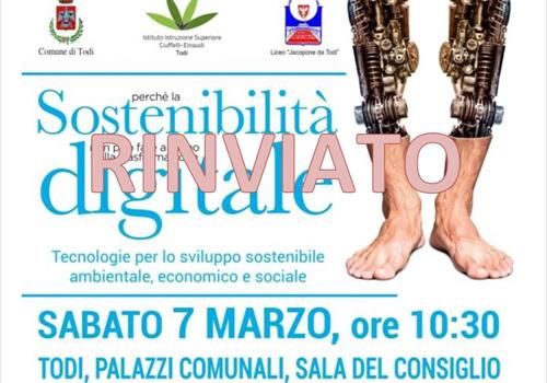 Si comunica che la “Conferenza sulla sostenibilità digitale”, prevista per il giorno 7 marzo p.v. a Todi, è stata rinviata a data da destinarsi....