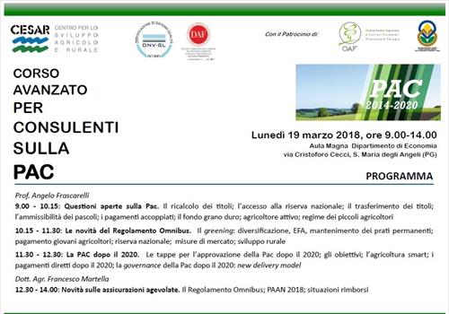 Si pubblica in allegato il programma del “Corso Avanzato di aggiornamento per consulenti sulla PAC” in programma per il giorno Lunedì 19 marzo 2018, ...