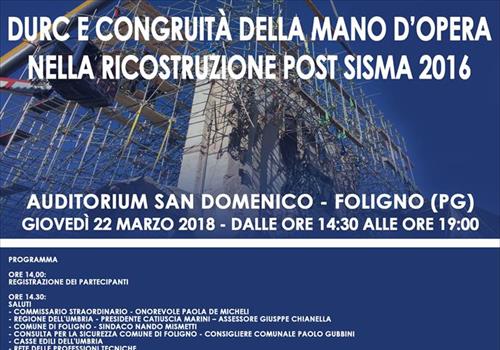 La Rete delle Professioni Tecniche dell´Umbria ha organizzato il Seminario "DURC e congruità della manodopera nella ricostruzione post sisma 2016" che...