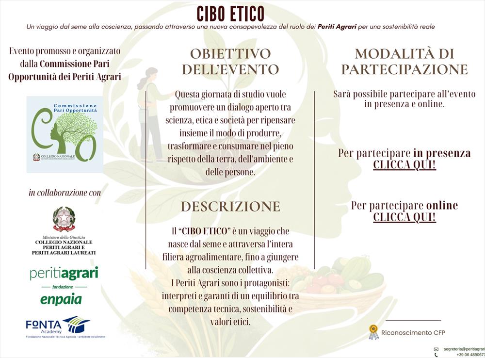 La Commissione Pari Opportunità del Collegio Nazionale dei Periti Agrari, in collaborazione con la FONDAZIONE ENPAIA e Fo.N.T.A. Academy, organizza per il giorno Giovedì 19 marzo alle ore 10.00, presso la sede ENPAIA – Sala Oriana Fallaci - Viale Beethoven, 48, Roma, ed in modalità online su piattaforma GoTo, l’evento formativo “CIBO ETICO”.